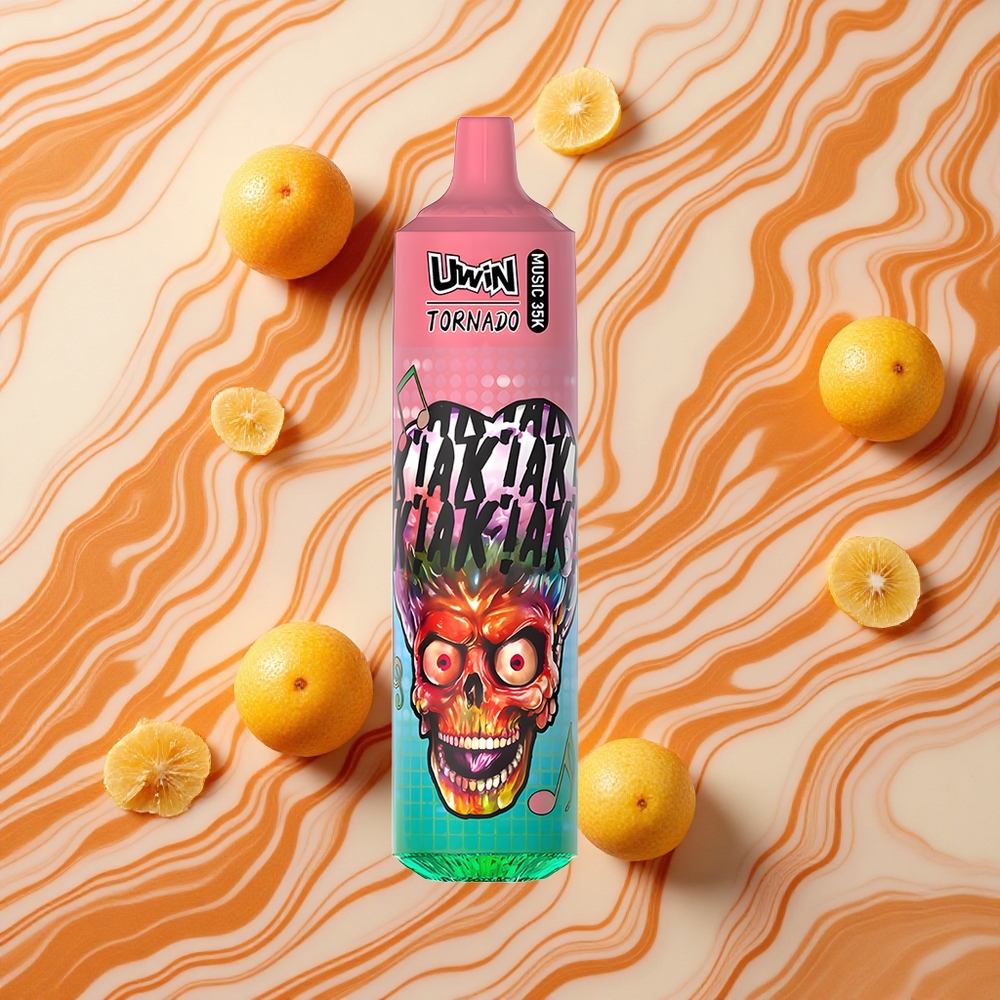 Persiku Mango Ananāsu Uwin Tornado 35K Mūzikas izmēģinājams veips ar 35 000 ieelpu skaitu un 600mAh uzlādējamo bateriju