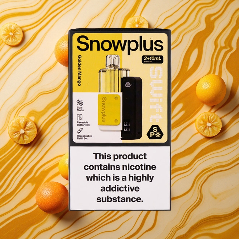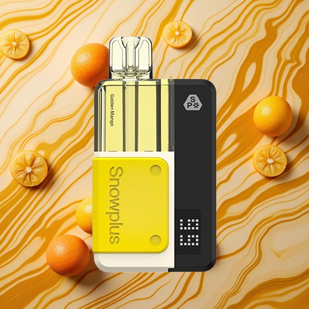 Zelta mango Snowplus Swift 5000 Puffs Prefilled Pod Kit ar 1000 mAh bateriju un 2+10 ml e-šķidruma tilpumu